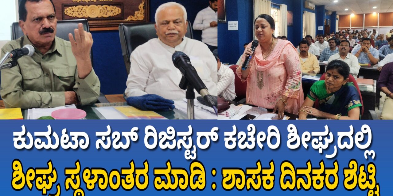 ಕಾರವಾರ : ಉತ್ತರಕನ್ನಡ ಜಿಲ್ಲೆಯ ಕುಮಟಾ ಪಟ್ಟಣದಲ್ಲಿ ಕೋಟ್ಯಾಂತರ ರೂಪಾಯಿ ವೆಚ್ಚದಲ್ಲಿ ನಿರ್ಮಾಣವಾದ ತಾಲೂಕಾ ಆಡಳಿತ ಸೌಧ ಕಟ್ಟಡಕ್ಕೆ ಸಬ್ ರಿಜಿಸ್ಟರ್ ಕಚೇರಿ ಸ್ಥಳಾಂತರವಾಗದೆ ಇರುವ ಬಗ್ಗೆ ಕುಮಟಾ ಶಾಸಕ ದಿನಕರ ಶೆಟ್ಟಿ ಅಧಿಕಾರಿಗಳನ್ನ ತರಾಟೆಗೆ ತೆಗೆದುಕೊಂಡರು.